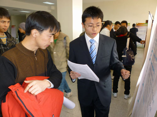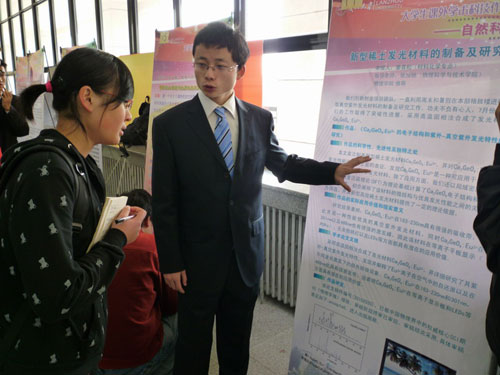 在图书馆二楼大厅的自然科学类展区有我院《新型稀土发光材料的制备与研究》等四项科研课题。下午一点左右,专家在前来指导时,询问了该研究项目的应用价值与创新性,对此申报人08级材料化学专业的秦青松作了详细的讲解。本展区也展有我院其他优秀学术科技项目。