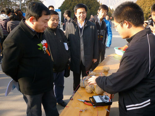 开幕式结束后,王书记一行来到了大厅内科技制作类展区,相关学术作品负责人做了详细的讲解。随后,王书记一行人来到隆基大道的各院科技作品展区进行参观。在我院展台前展示的“滴水发电”、“云的形成”、“土豆电池”、“LCD显示贪吃蛇游戏”等科技制作引起了王书记等领导极大的兴趣,讲解员们一一作了细致的讲解和分析,王书记很满意,并希望以后这一类的科技创新可以做得更完美,更系统化,并积极鼓励更多的同学前来参与,培养实践能力,做出更多的课题,加以推广应用。在土木工程学院的仿真模型设计大赛作品前,王书记等饶有兴趣地观看了世博展区中国馆模型、校体育馆、博物馆等建筑模型。在兰州大学绿队的“废物利用”展台前,参观了用各种废弃物制作的精品手工艺品,并对两位同学身穿的各种废旧塑料和报纸精心制作的衣服十分好奇。在数学与统计学院的展台前,王书记等领导了解了全国数学竞赛中获奖情况及数学建模成果。